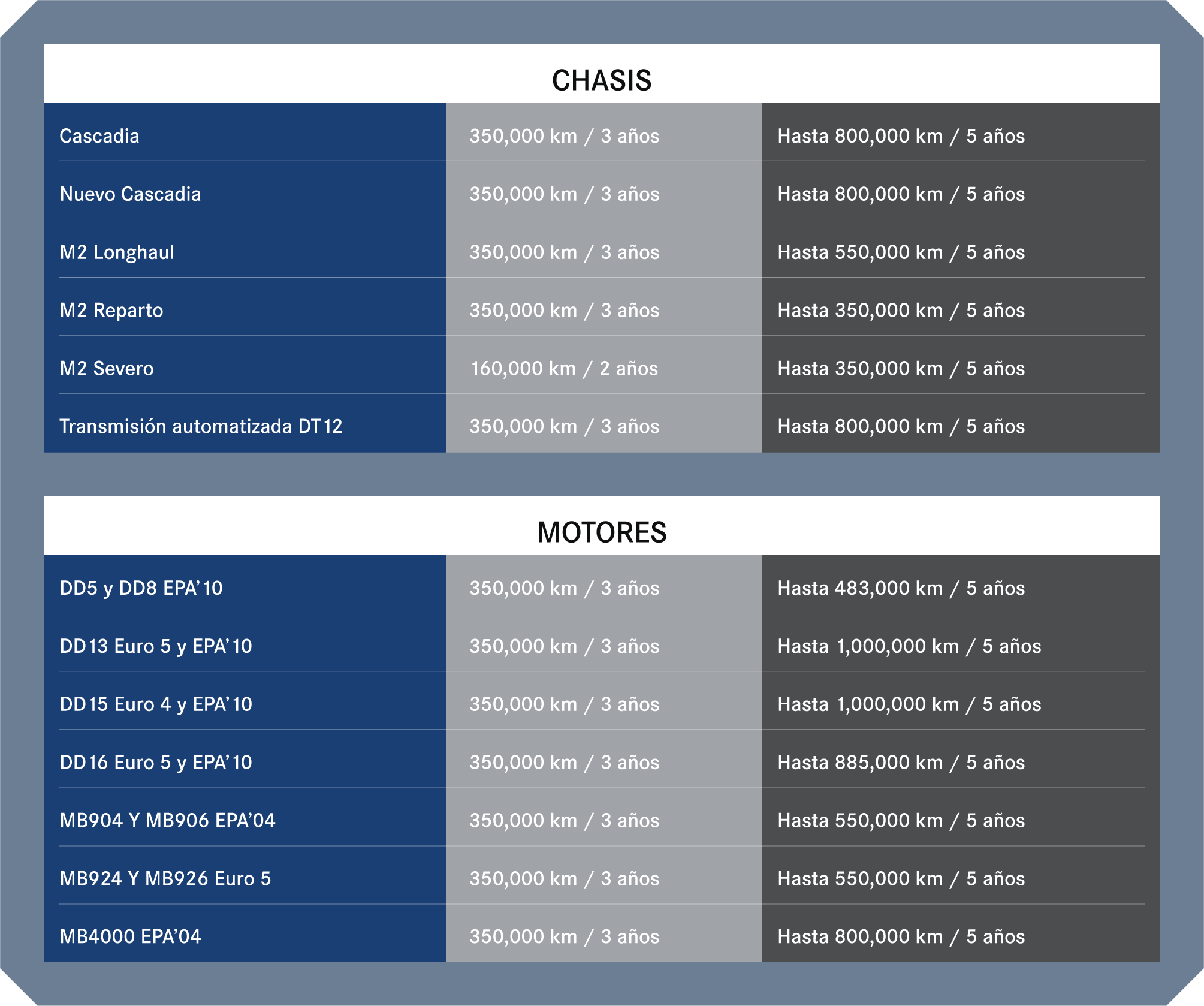 Incluyendo motor y tren motriz en todos nuestros productos hasta, para Cascadia (DD13, DD 15 y DD16) 5 años o 750,000 km y M2 (para todos los motores) 5 años o 510,000 km